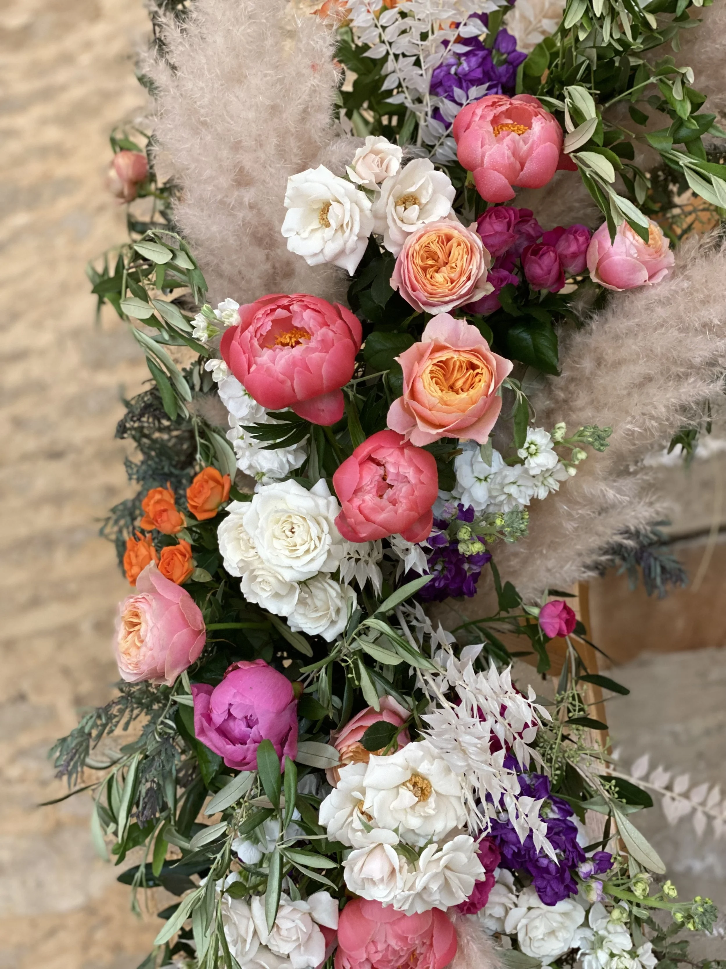 Sunset shades gently softened by delicate ivory tones, and artfully combined with dried materials, created a fun and unique look.