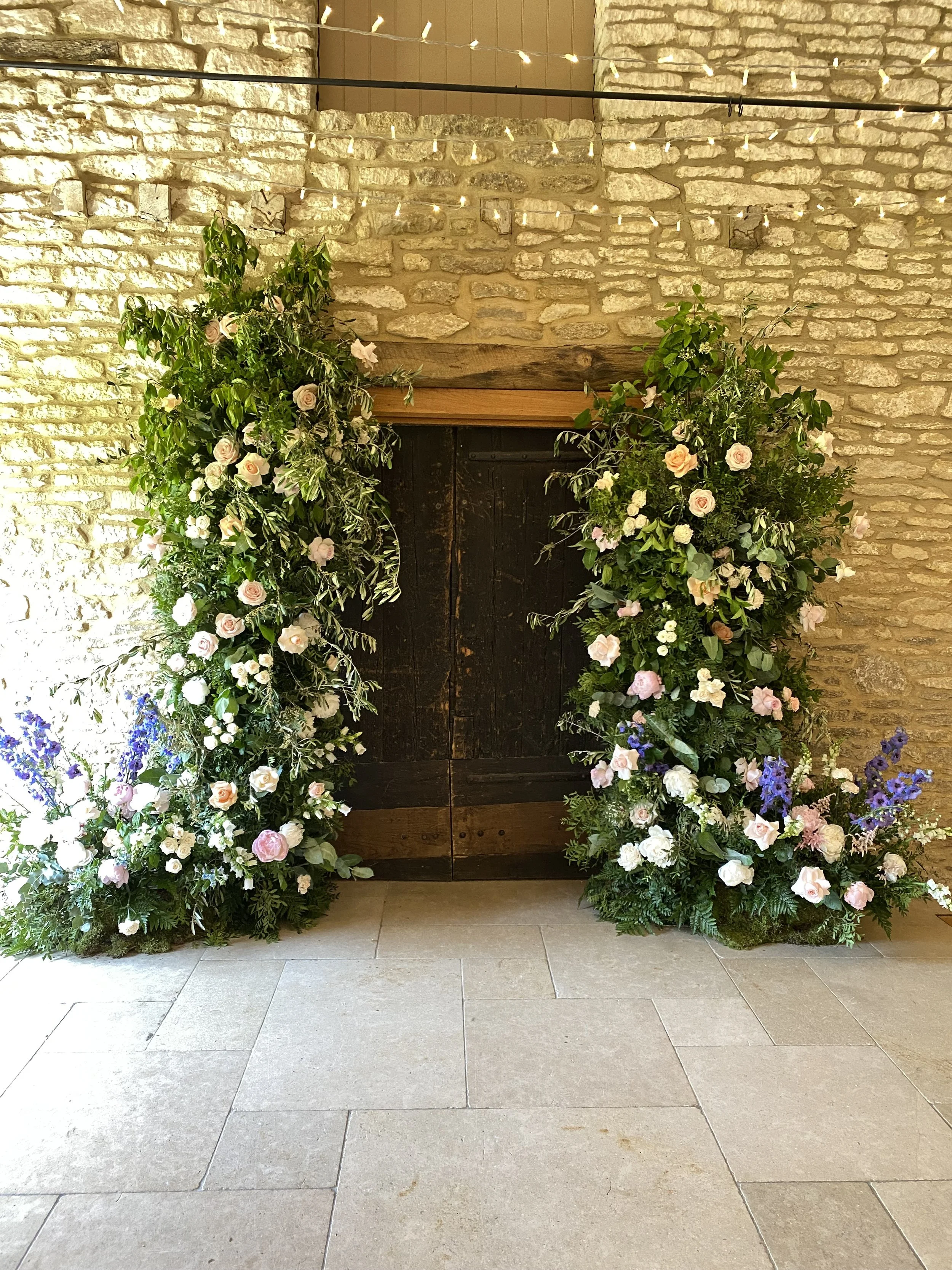Flowing and natural florals created with white and chinal blue blooms and leafy spring green foliage.